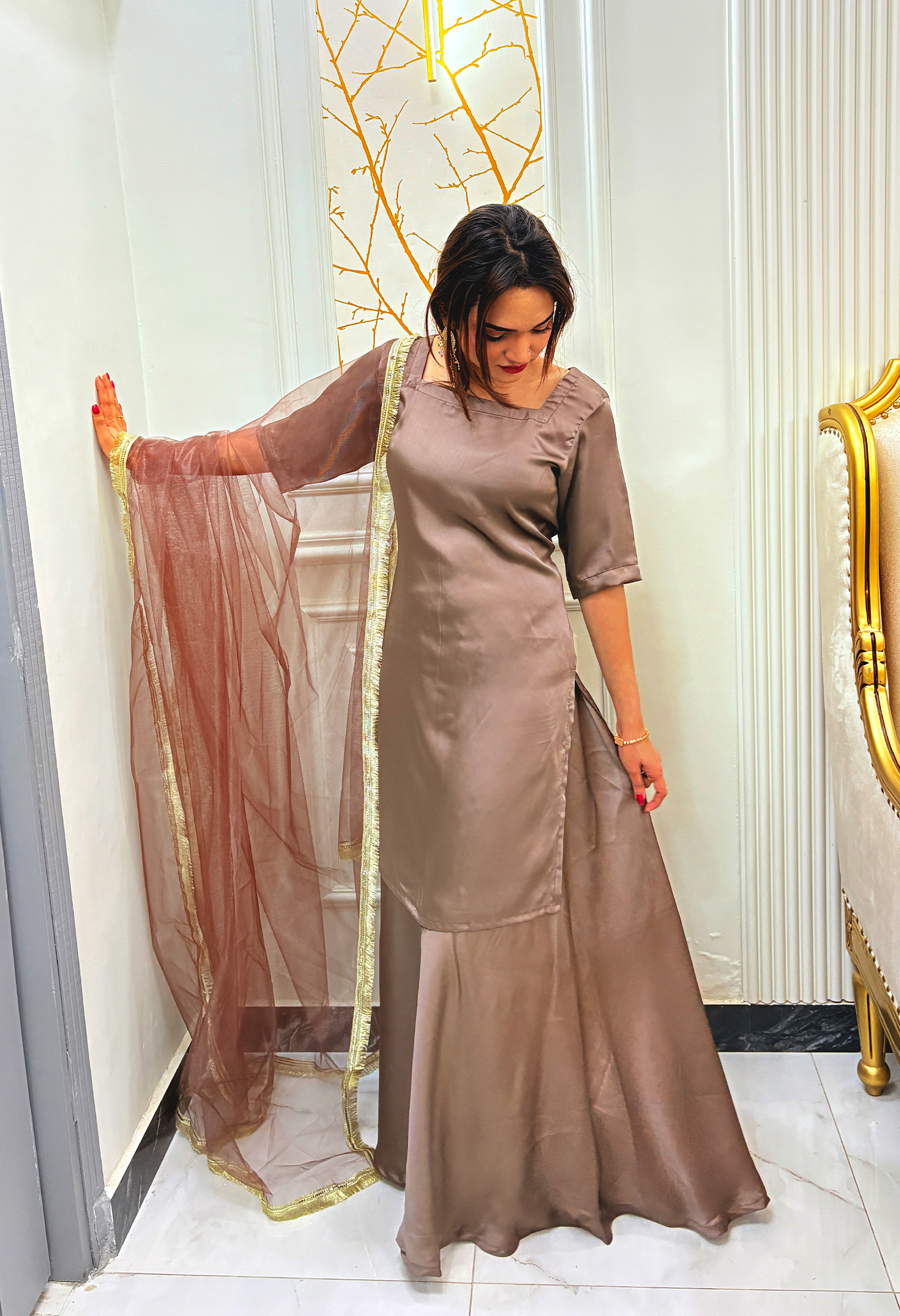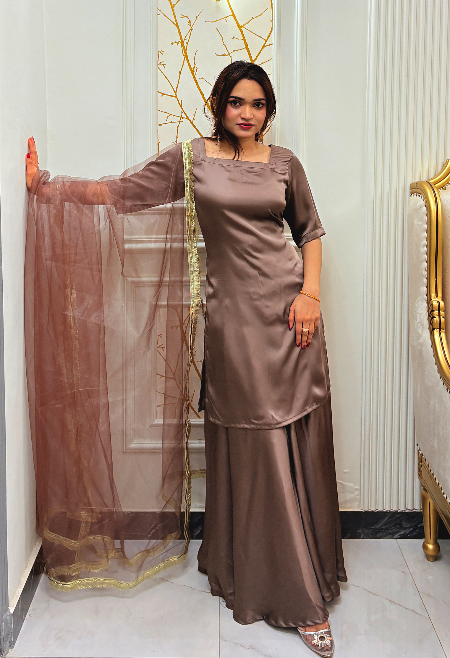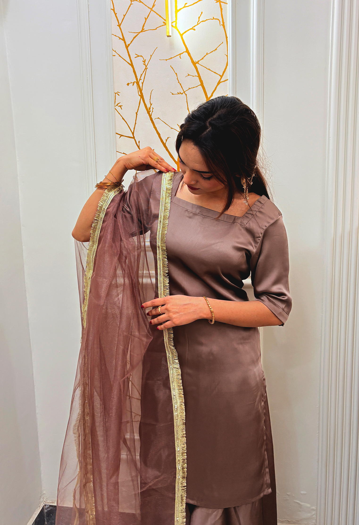 Elevate your style with this luxurious brown silk 3-piece outfit. The premium silk shirt and matching plazo offer a smooth, rich finish, while the delicate 4 sided lace net dupatta adds a soft and graceful touch. Perfect for weddings, festive occasions, and formal events, this outfit brings elegance and sophistication to your wardrobe.